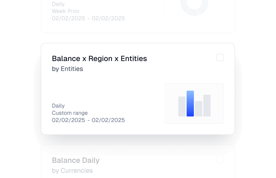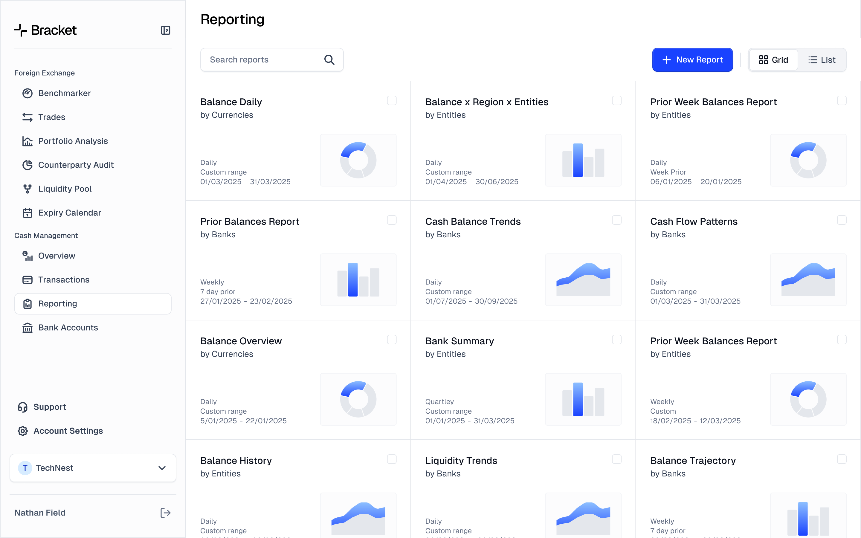 Bracket provides visual dashboards, exportable reports, and raw data access. You can filter by entity, bank, currency, and time period.